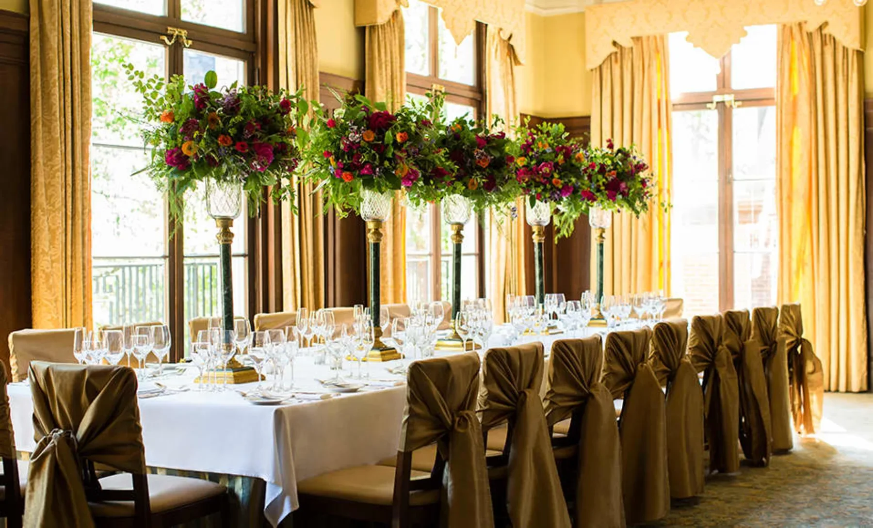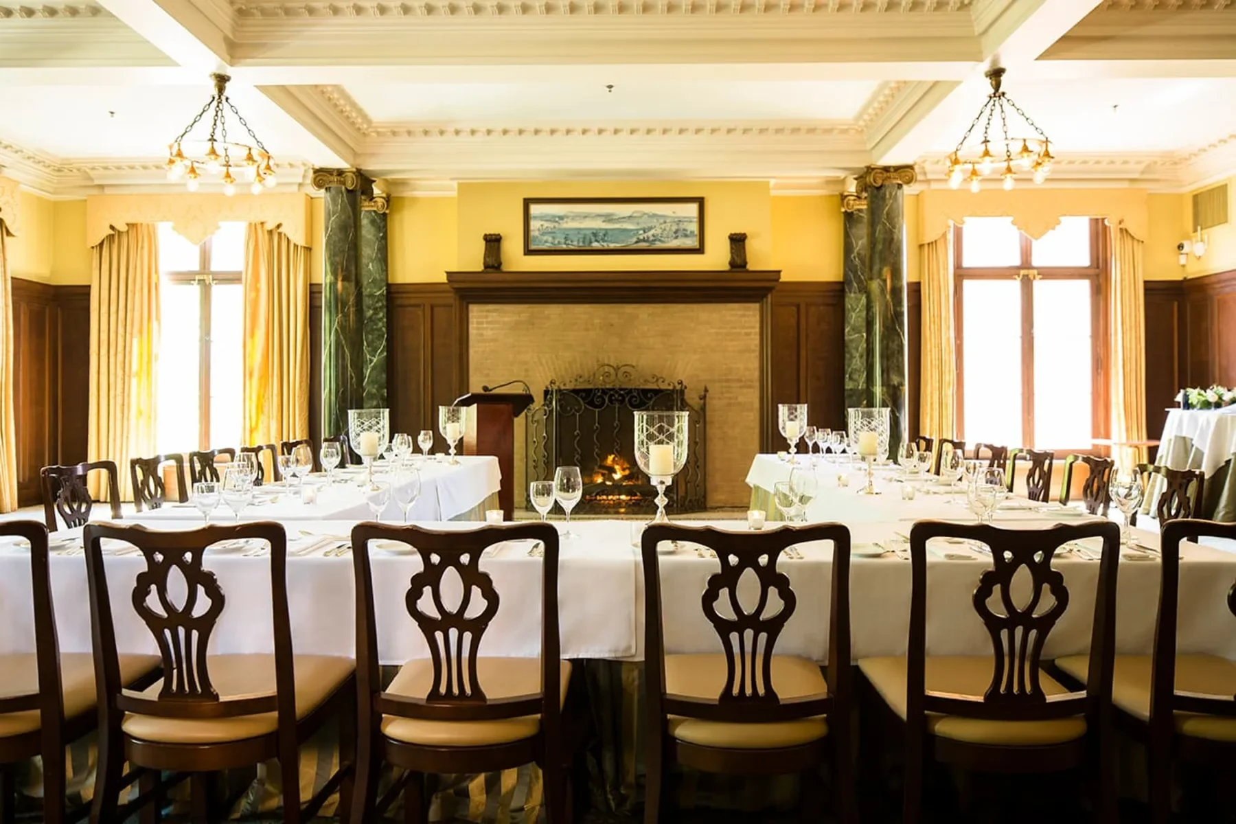 High ornate ceilings, wood paneling, a grand working fireplace, marble columns and a façade of windows overlooking Yale University create an impressive atmosphere and the perfect template for an elegant, memorable affair. Natural light from oversized French doors floods the room and can be opened to bring in fresh air.